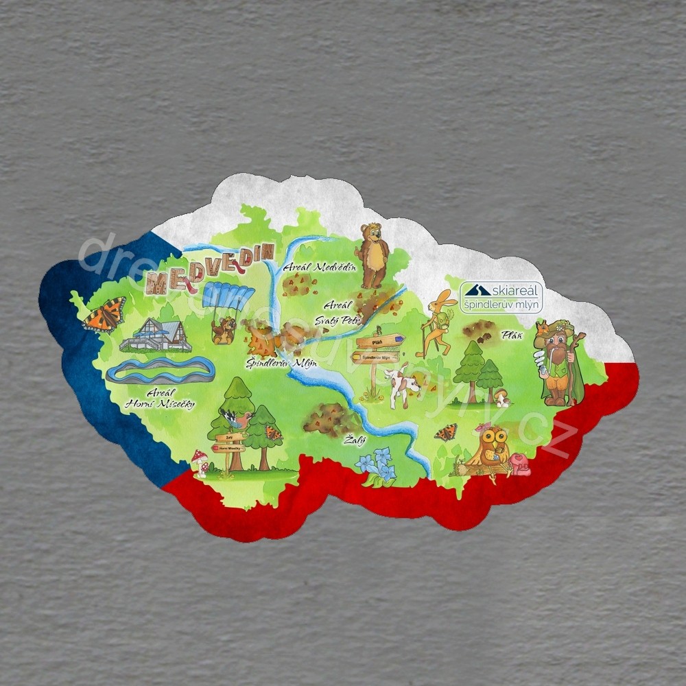 Špindlerův Mlýn - Skiareál - kresba - magnet mapa rám vlajka
