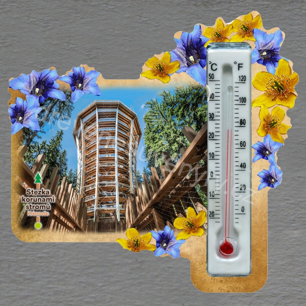 Stezka korunami stromů - Krkonoše - magnet s teploměrem - obdélník s květy - žluto-modré